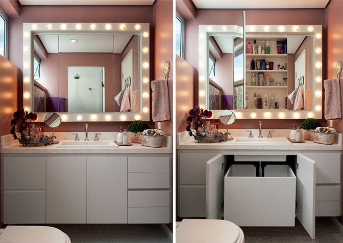 Qual a mulher que não sonha em ter uma penteadeira de camarim? Se não tem espaço pra fazer, que tal levar o glamour de um camarim para o banheiro mesmo?