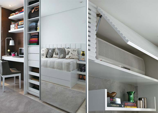 Já na imagem da direita, uma ideia sensacional para esconder o ar condicionado enquanto não está sendo usado. #amei