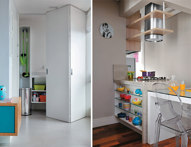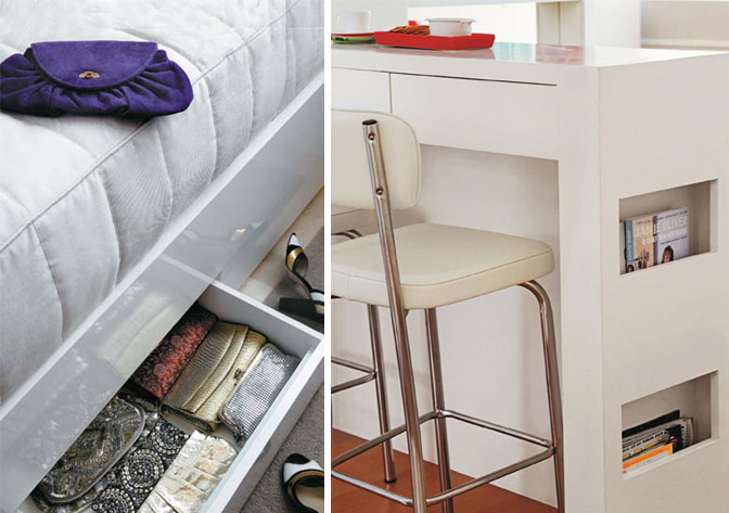Na imagem da direita temos uma ótima forma de aproveitar a lateral de balcões e outros móveis. Que tal guardar livros e revistas ali?