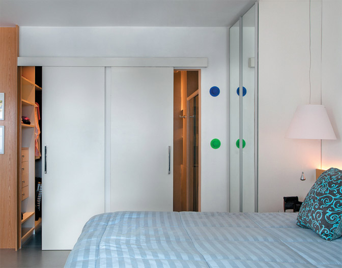 Portas de correr economizam espaço na hora de abrir e integram ambientes. Neste caso tem um closet de um lado e um banheiro do outro, ambos com saída para o quarto.