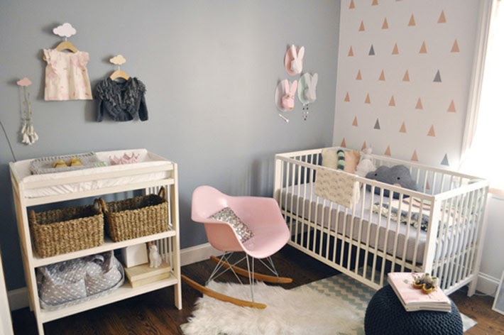 Quarto de bebê cinza, rosa e verde com tema de coelhinhos