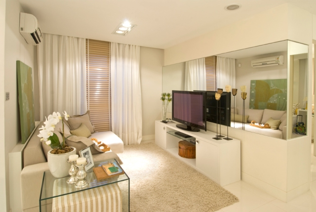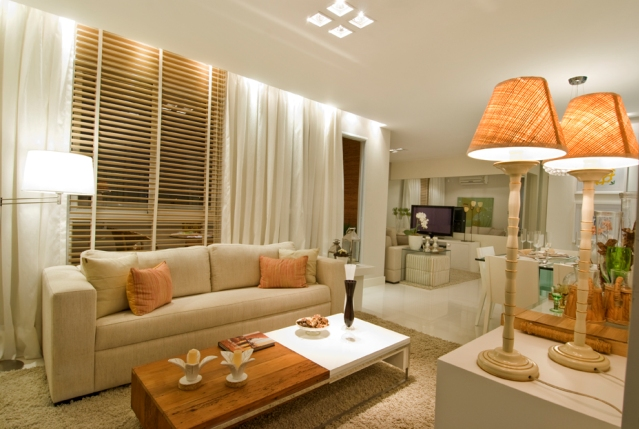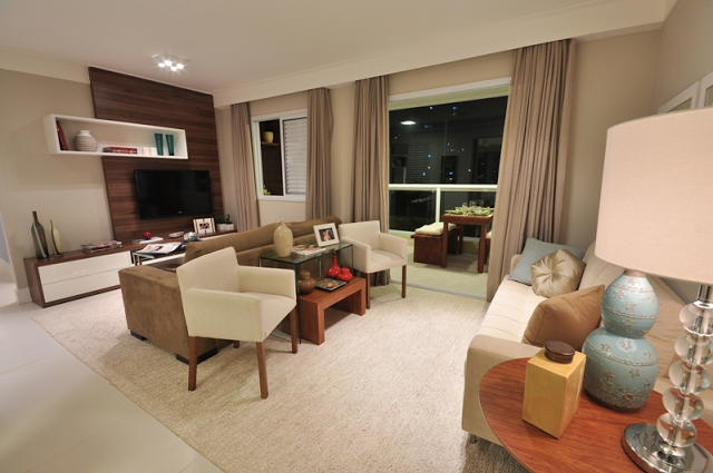 3º modelo decorado PÁRA TUDOOOOO! Este é bem parecido com o layout da minha planta!!! (Mas claro que o meu é menor, né rs) Por exemplo, onde tem essa folga para o sofá no canto direito da foto, o meu não vai ter, ele já vai ficar em cima da porta da varanda, mas a janelinha de correr, que era do 3º quarto, vai ficar assim na sala da tv e eu penso em fazer praticamente o mesmo que nesse decorado, deixar um sofá atrás do outro (praticamente um cinema em casa rsrs)