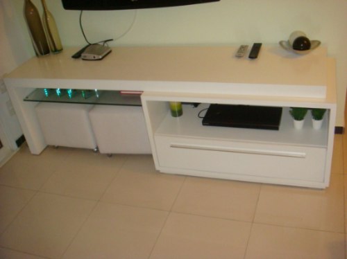 Quero ter uma bancada ou um rack para a tv, dvd, video-game, etc. Para ele, estou pensando em algum que caibam os puffs debaixo como estes exemplos: